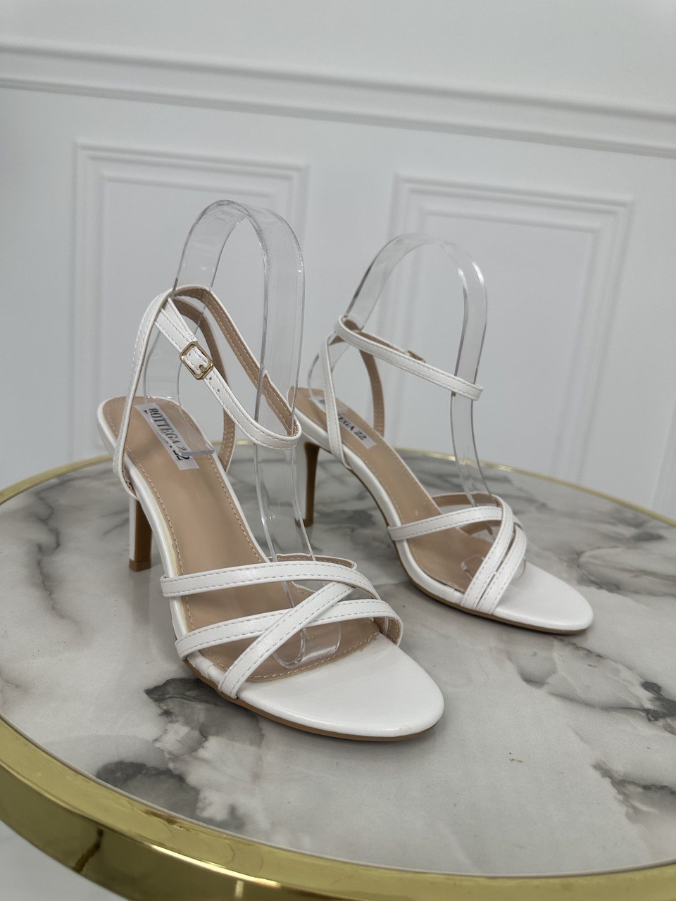 Sandali in ecopelle con fasce sottili ad incrocio chiusura con cinturino e tacco di 8 cm