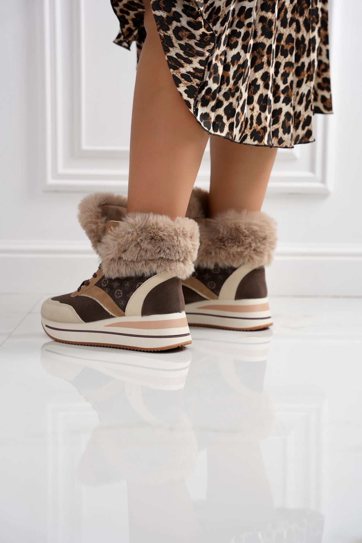 Scarpetta con tomaia in tessuto a collo alta decorata con pelliccia , interno in tessuto , chiusura con lacci e fondo in gomma di 4 cm