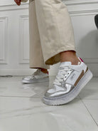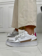 Scarpetta in ecopelle bianca con dettagli in argento e oro , talloncino fucsia , chiusura con lacci e fondo in gomma di 3 cm