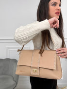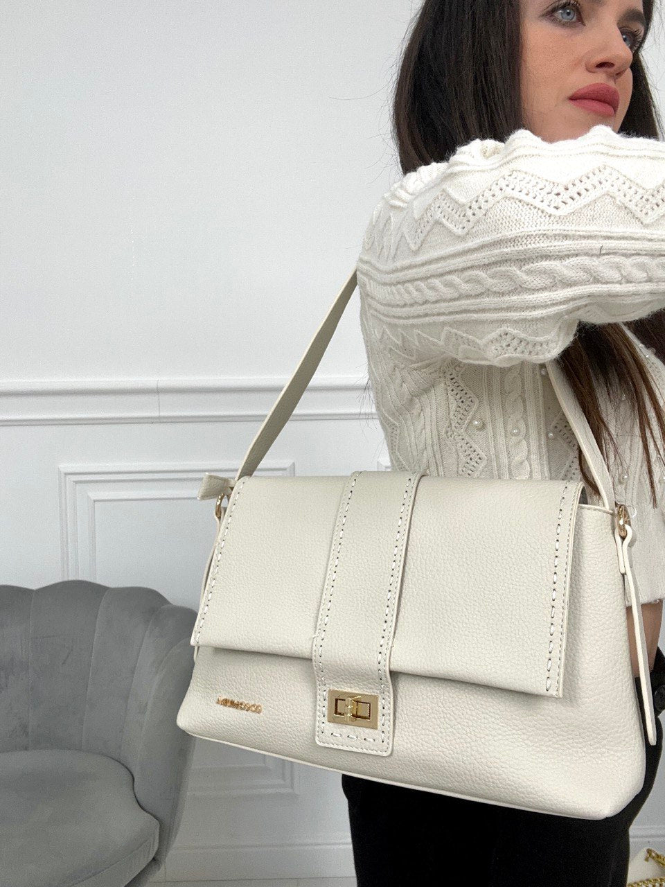 Borse in ecopelle con cuciture sul davanti , chiusura con bottone e cerniera , tasche interne , manico da braccio e tracolla da spalla removibile.