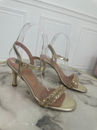 Sandali in pelle con fascia decorata con piccoli strass , chiusura con cinturino e tacco di 8 cm