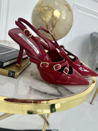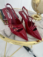 Decolletè a punta in vernice con fibbiette sul davanti , chiusura con cinturino e tacco di 8 cm