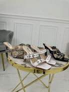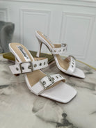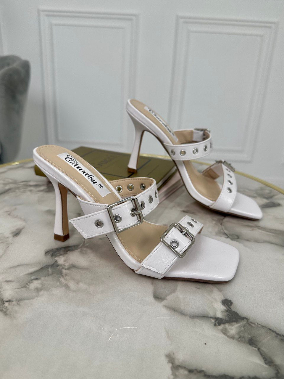 Sandali in ecopelle ,con fasce su davanti regolabili con fibbie , aperti sul retro con tacco di 8 cm