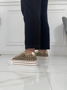 Scarpetta on tessuto leopardato con talloncino in oro , chiusura con lacci e fondo in gomma di 3 cm