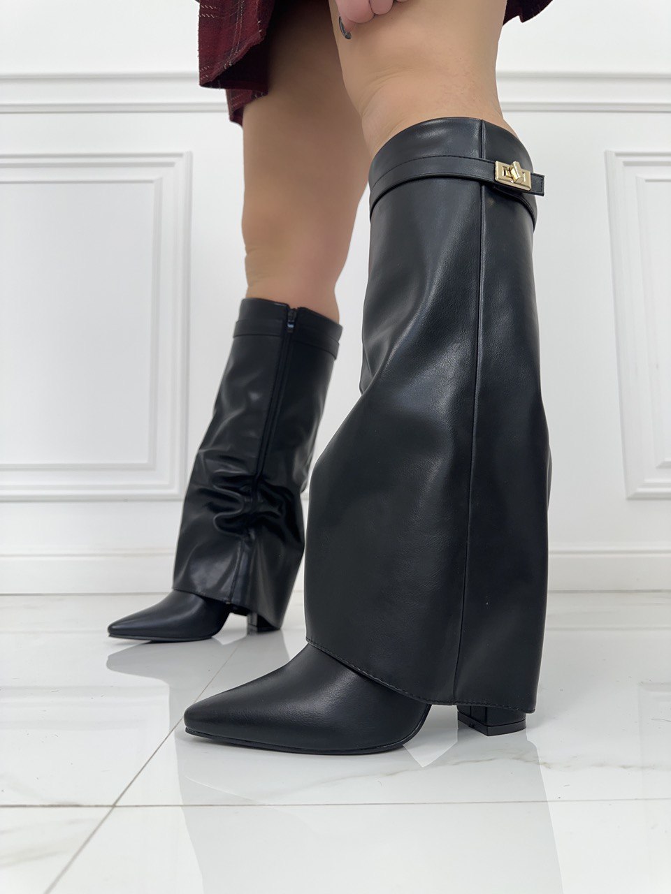 Stivale a punta in ecopelle , con risvolto dettaglio dorato laterale e chiusura con cerniera , tacco largo di 9 cm