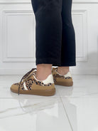 Scarpetta con tomaia in tessuto leopardato , chiusura con lacci e fondo in gomma di 2 cm