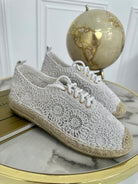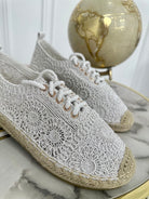 Scarpetta in tela , chiusura con lacci e fondo in corda di 2 cm