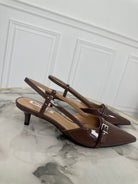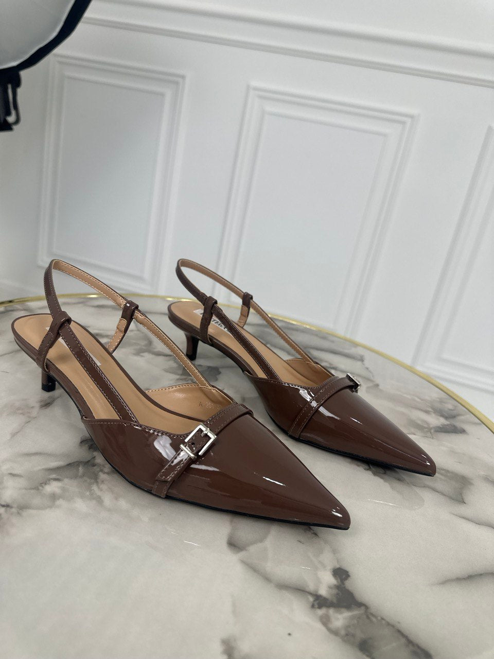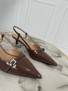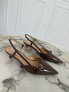 Decolletè a punta in vernice con interno in ecopelle , fibbietta sul davanti e tacco di 4 cm