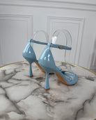 Sandali in vernice con fascia larga , interno in ecopelle , chiusura con cinturino e tacco a rocchetto di 10 cm