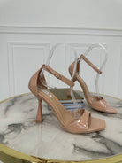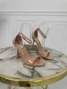 Sandali in vernice con fascia larga , interno in ecopelle , chiusura con cinturino e tacco a rocchetto di 10 cm