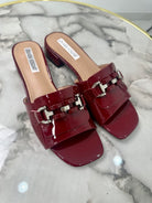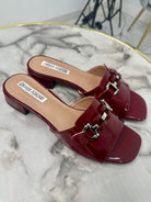 Sandali con fascia larga in vernice , aperti sul retro con tacco di 3 cm