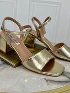 Sandali in ecopelle con fascia larga , chiusura con cinturino regolabile e tacco largo di 5 cm