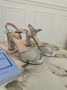 Sandali in ecopelle con fascia larga decorata con brillantini e strass , chiusura con cinturino e tacco largo di 8 cm