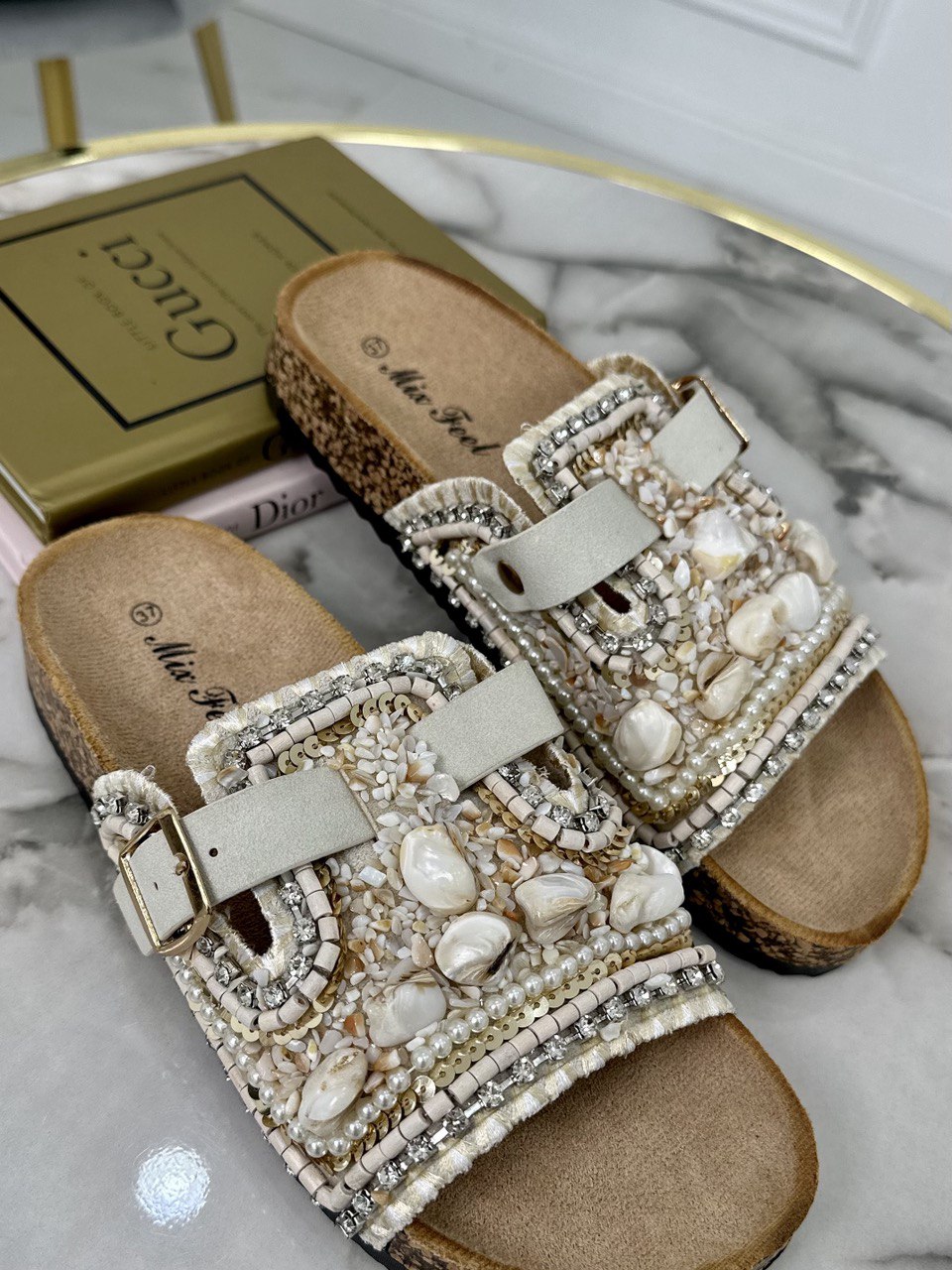 Ciabatta in tessuto con fascia larga decorata con perle e strass e piccole pietre , fibbietta regolabile e fondo in gomma