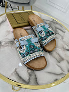 Ciabatta in tessuto con fascia larga decorata con perle e strass e piccole pietre , fibbietta regolabile e fondo in gomma