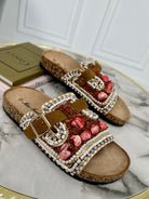 Ciabatta in tessuto con fascia larga decorata con perle e strass e piccole pietre , fibbietta regolabile e fondo in gomma