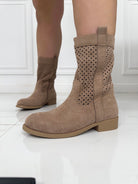 Stivaletti con tomaia in camoscio , gambale traforato , chiusura con cerniera laterale e tacchetto di 2 cm