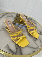 Sandali in vernice con fasce ad incrocio con fibbia regolabile aperti sul retro con tacco di 4 cm