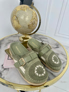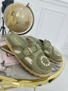Ciabatta in tessuto con fibbia sul davanti aperta sul retro con fondo in gomma di 2 cm