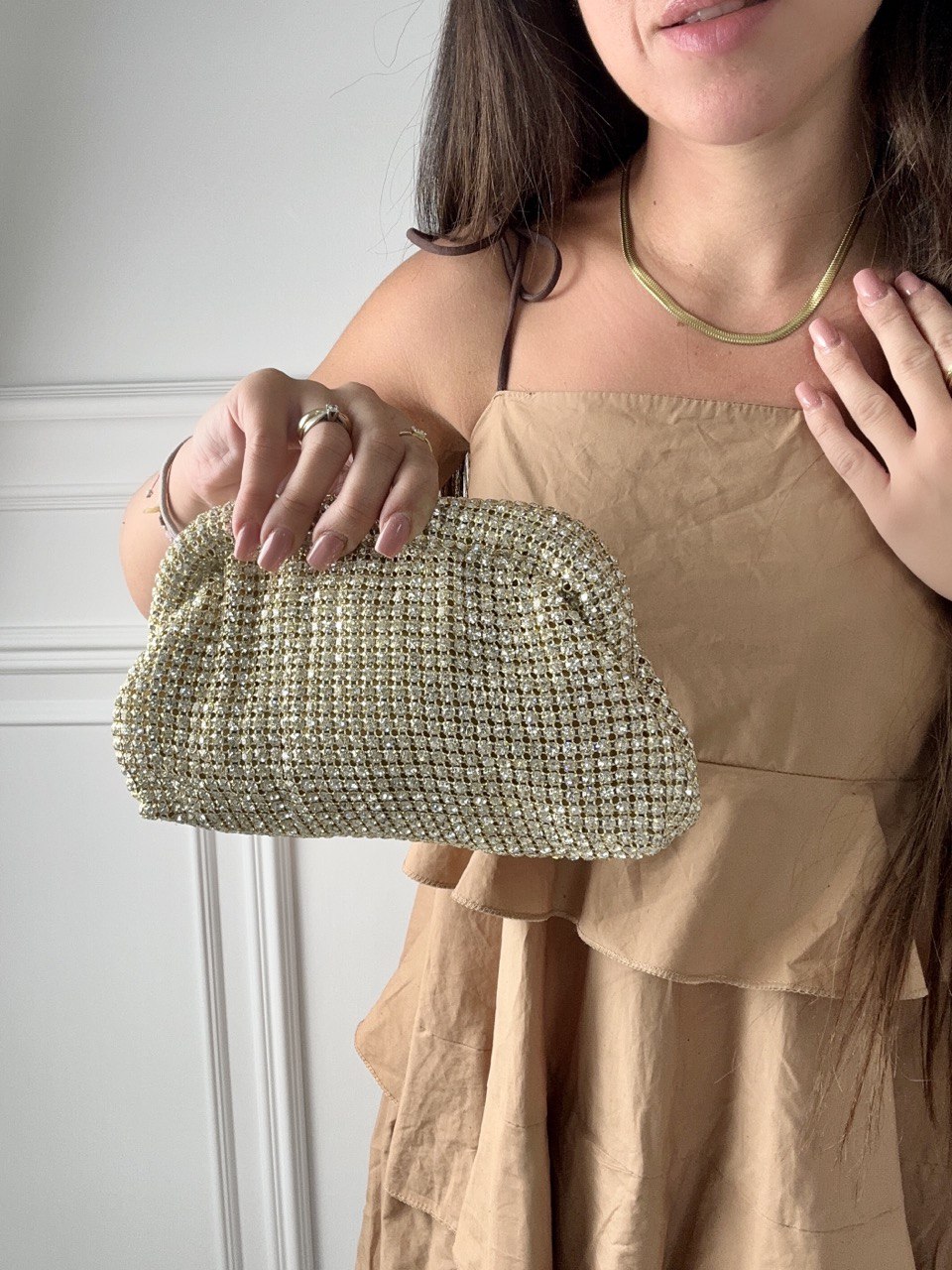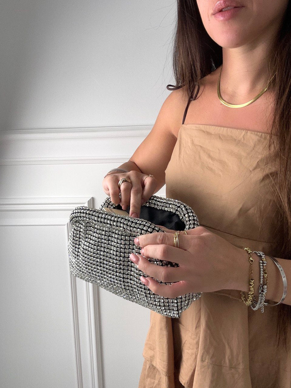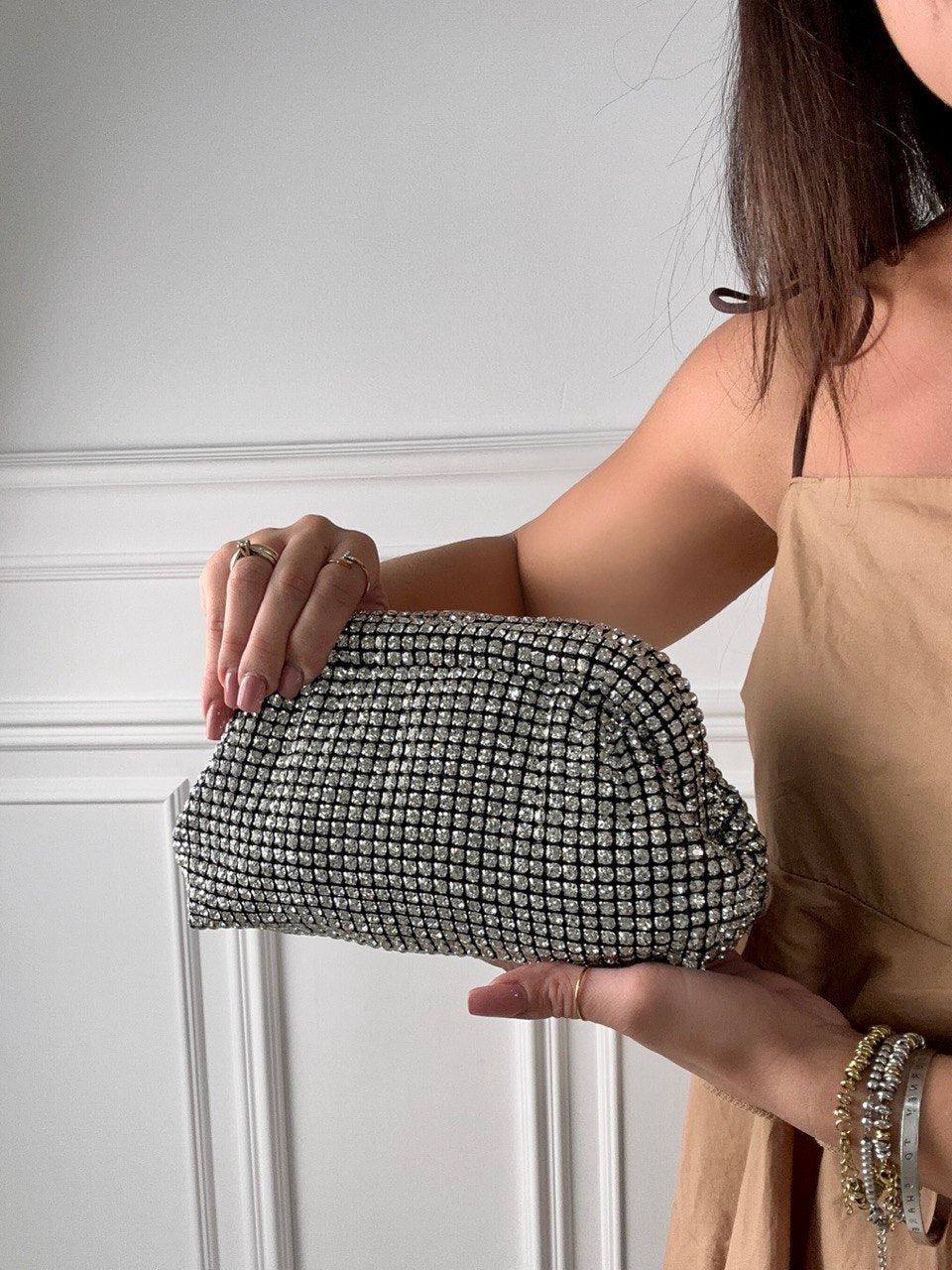 Borsetta in tessuto ricoperta interamente di strass e tracolla da spalla in catena.