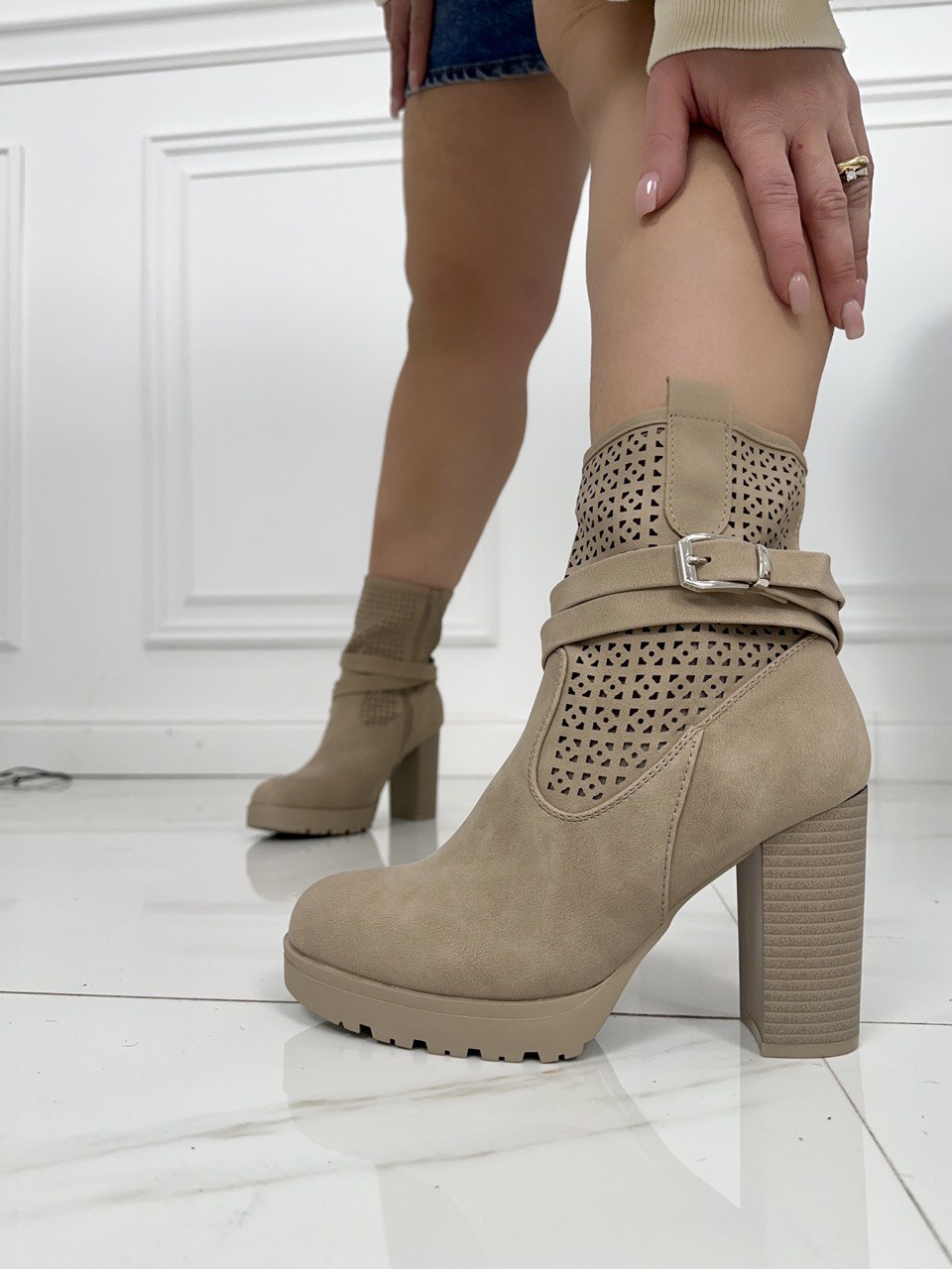 Stivaletti in ecopelle con gambale traforato decorati con cinturino laterale , chiusura con cerniera e tacco largo di 9 cm