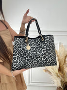 Borsa in ecopelle con tomaia leopardata , chiusura con cerniera , manico da braccio e tracolla da spalla removibile.