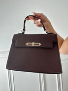 Borsa in ecopelle , con interno in tessuto , chiusura con bottone a calamita e cerniera , manico e tracolla da spalla removibile.