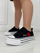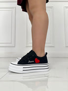 Scarpetta in tela , decorata con cuore laterale e scritta "Amore " , chiusura con lacci e fondo in gomma di 4 cm