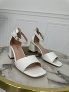 Sandali in ecopelle con fascia larga , chiusura con cinturino e tacco largo di 5 cm