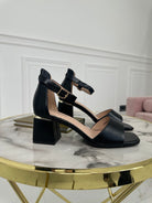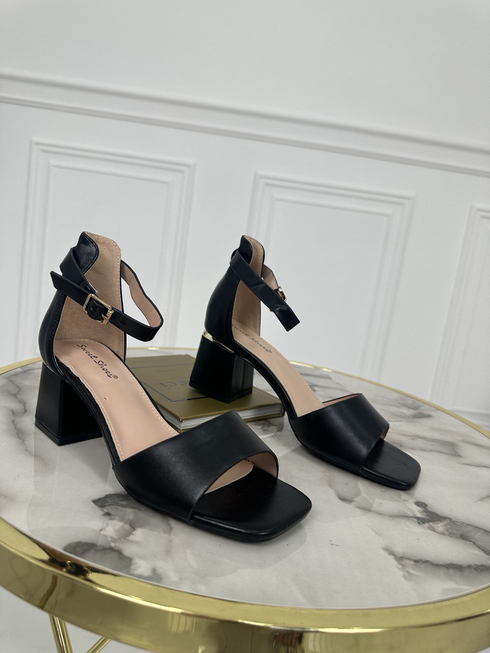 Sandali in ecopelle con fascia larga , chiusura con cinturino e tacco largo di 5 cm
