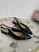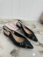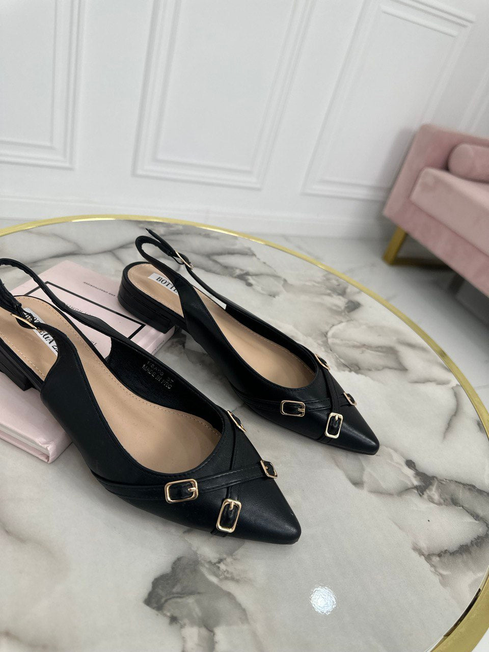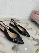 Ballerina a punta in ecopelle con fibbiette ad incrocio sul davanti , chiusura con cinturino e tacchetto di 2 cm