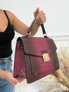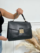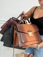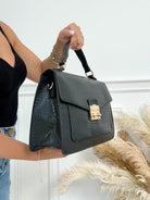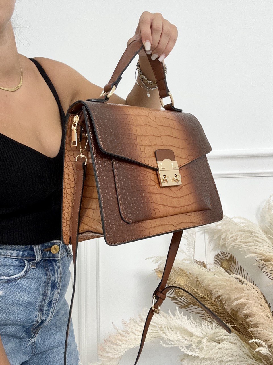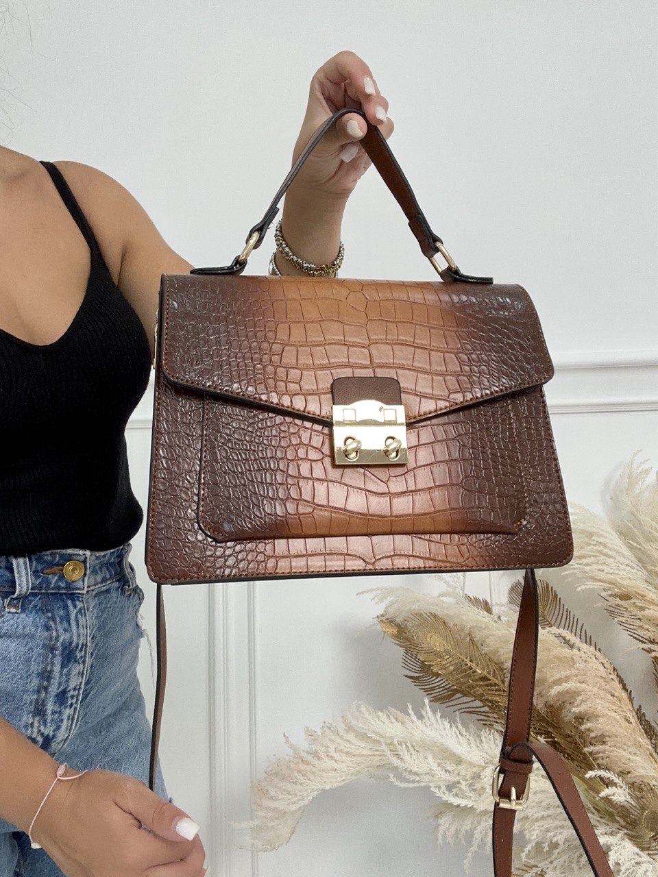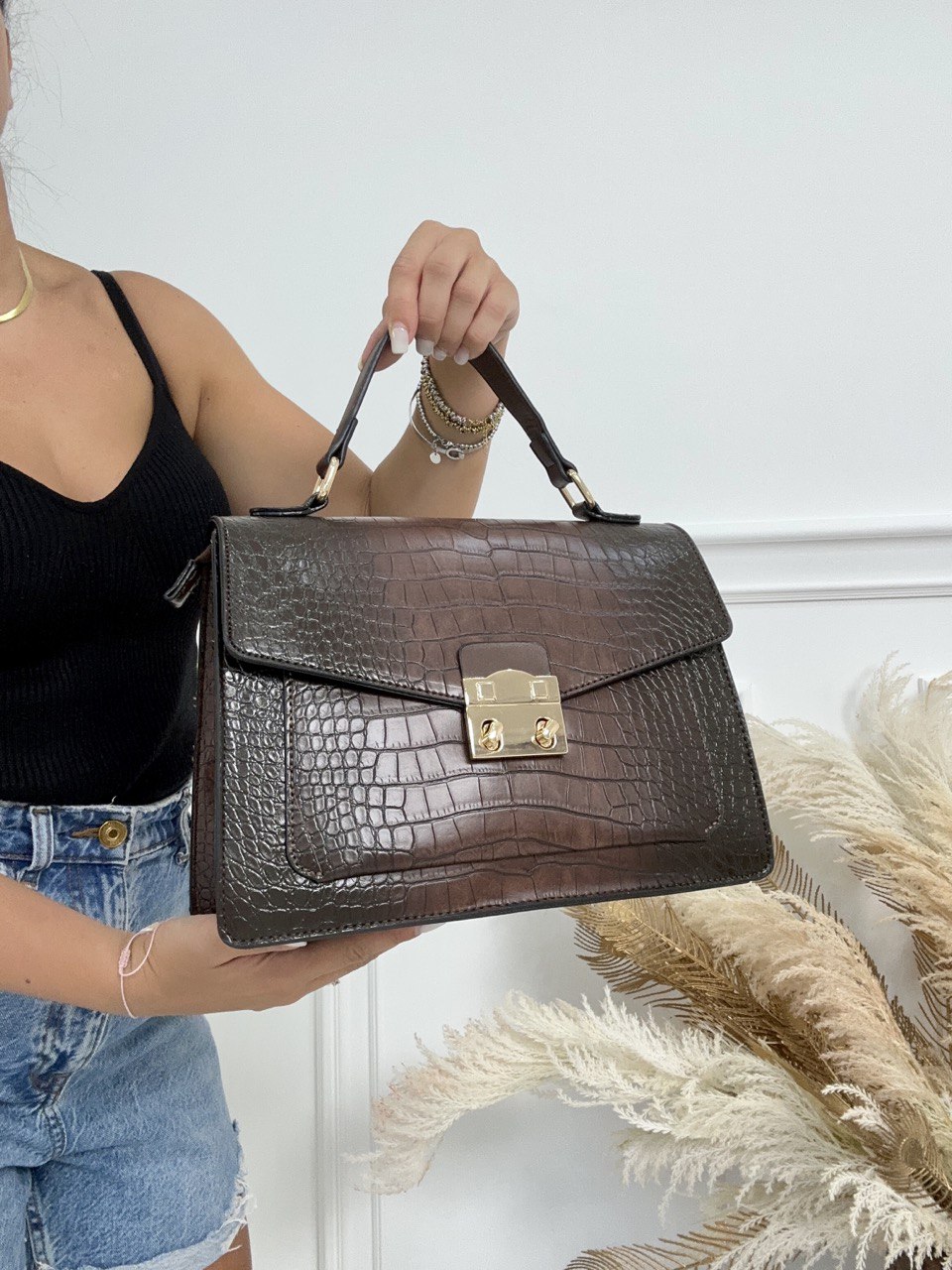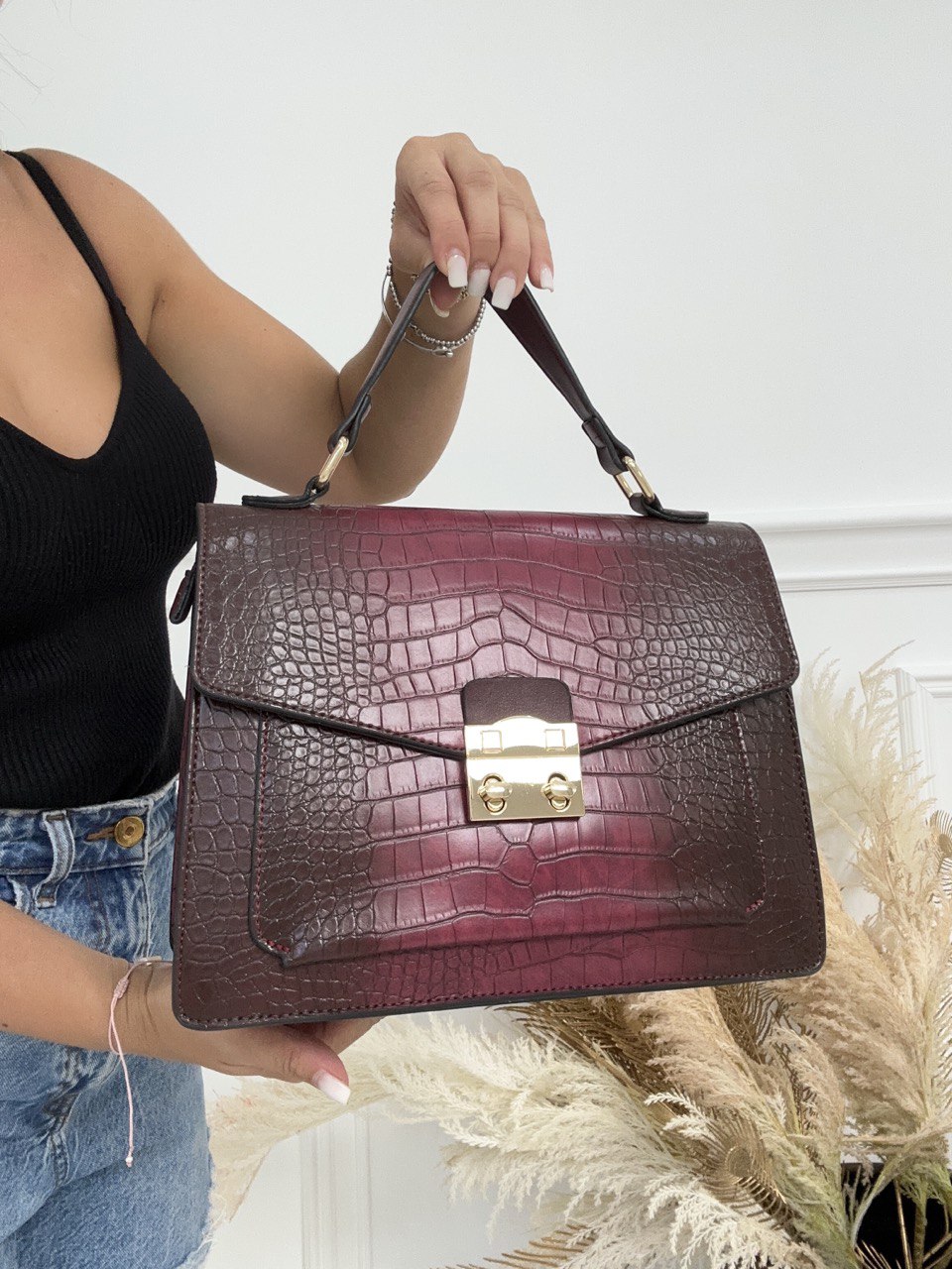 Borsa in ecopelle , chiusura con doppio bottone e cerniera , varie tasche interne , tracolla da spalla removibile e manico.
