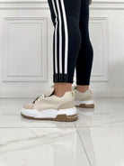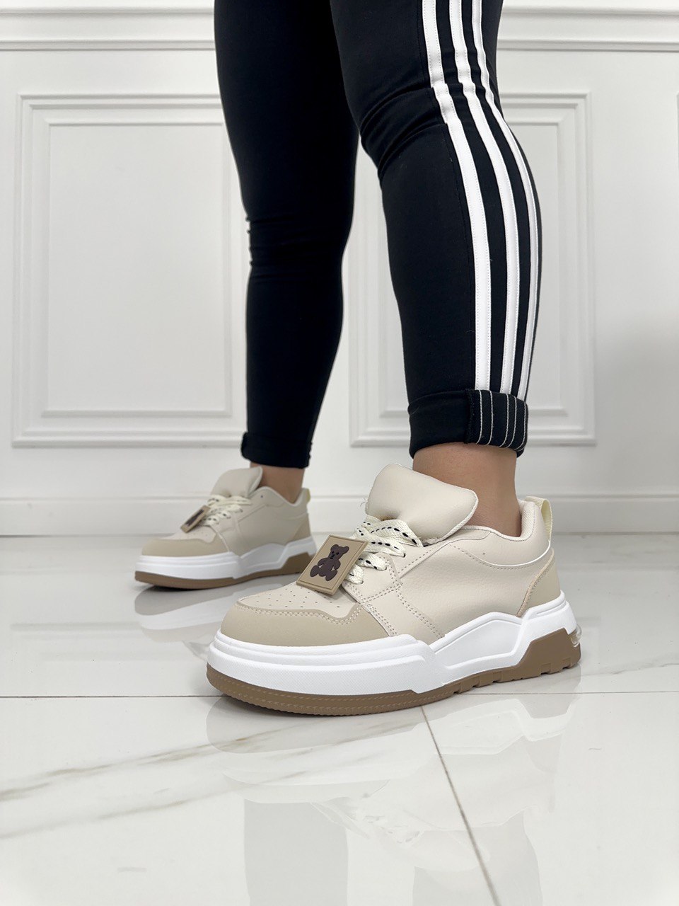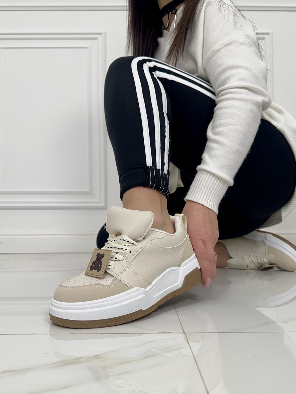 Scarpetta in ecopelle , con dettaglio sul davanti , chiusura con lacci e fondo in gomma di 3 cm