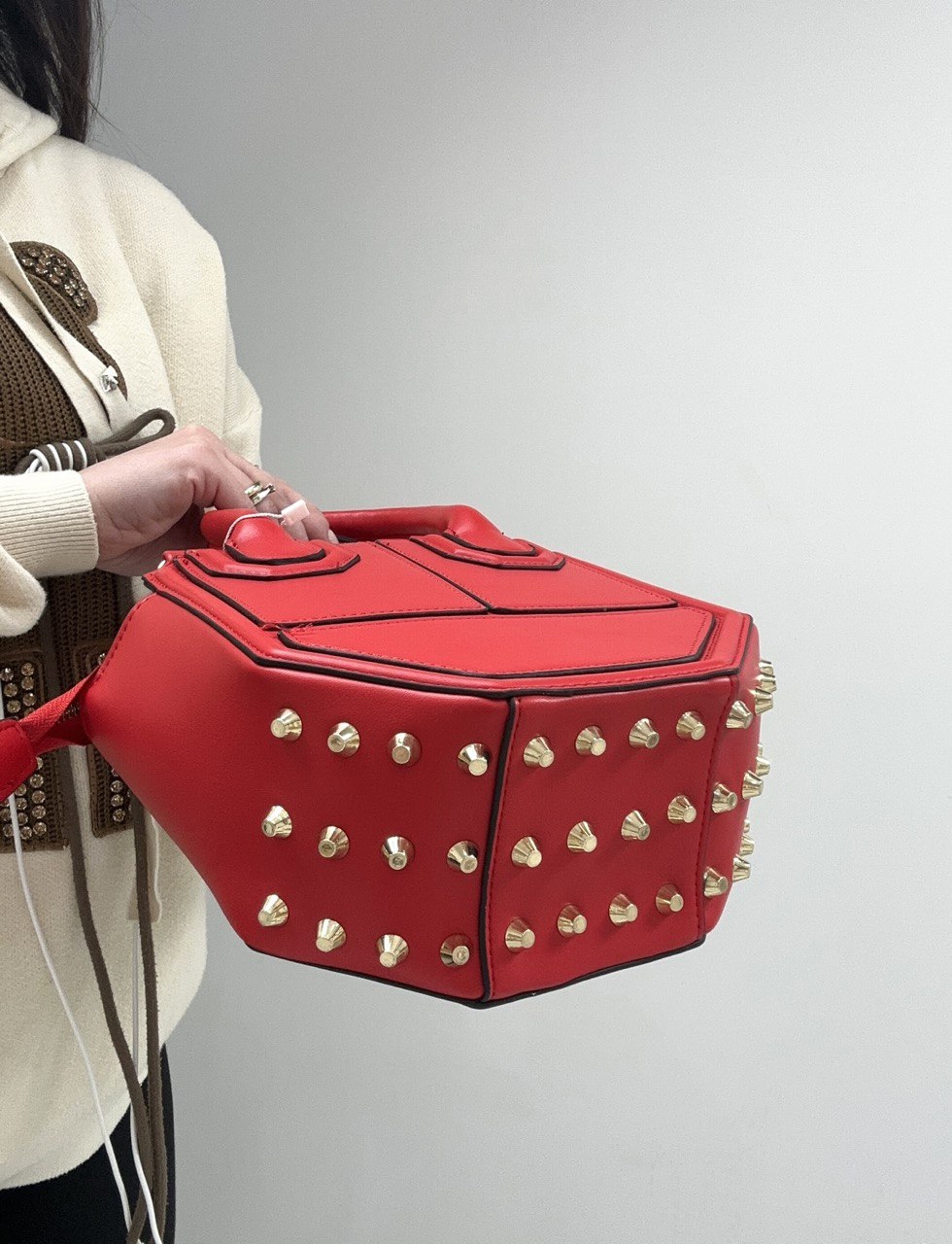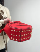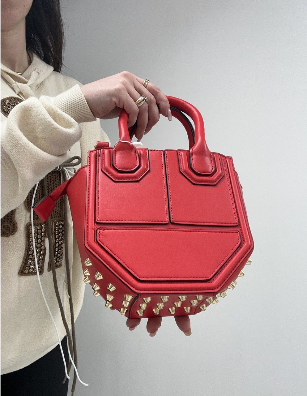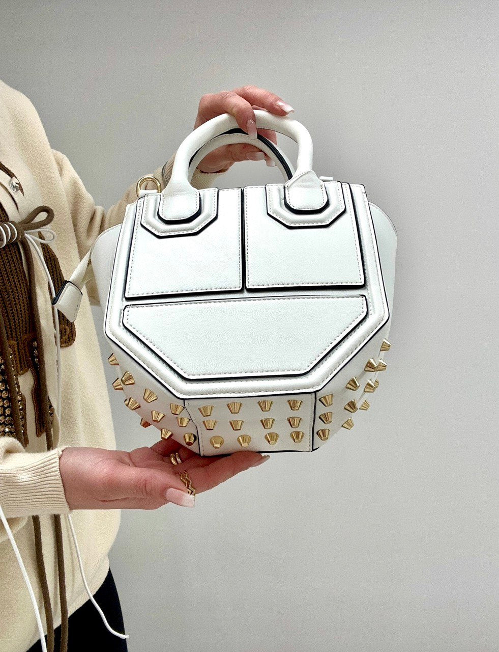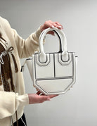 Borsetta rigida in misura h: 19 cm e L: 18 cm con manico da braccio e tracolla allungabile all'interno. Dettaglio in cuciture doppie solo sul davanti. Alla base ha borchie dorate