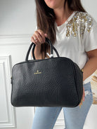 Borsa in ecopelle , chiusura con cerniera , manico e tracolla da spalla removibile.