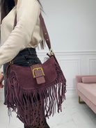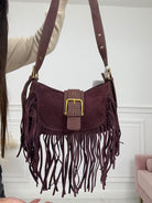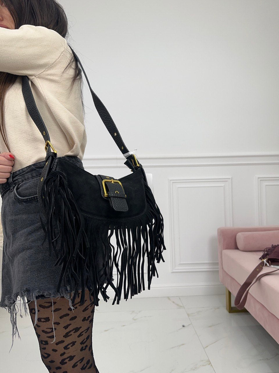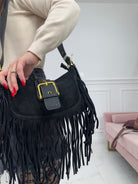 Borsetta in ecopelle e camoscio decorata con frange , chiusura con bottone a calamita e cerniera , e tracolla da spalla regolabile.
