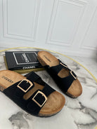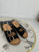 Pantofolina in ecopelle con fibbie regolabili , aperte sul retro con fondo in gomma