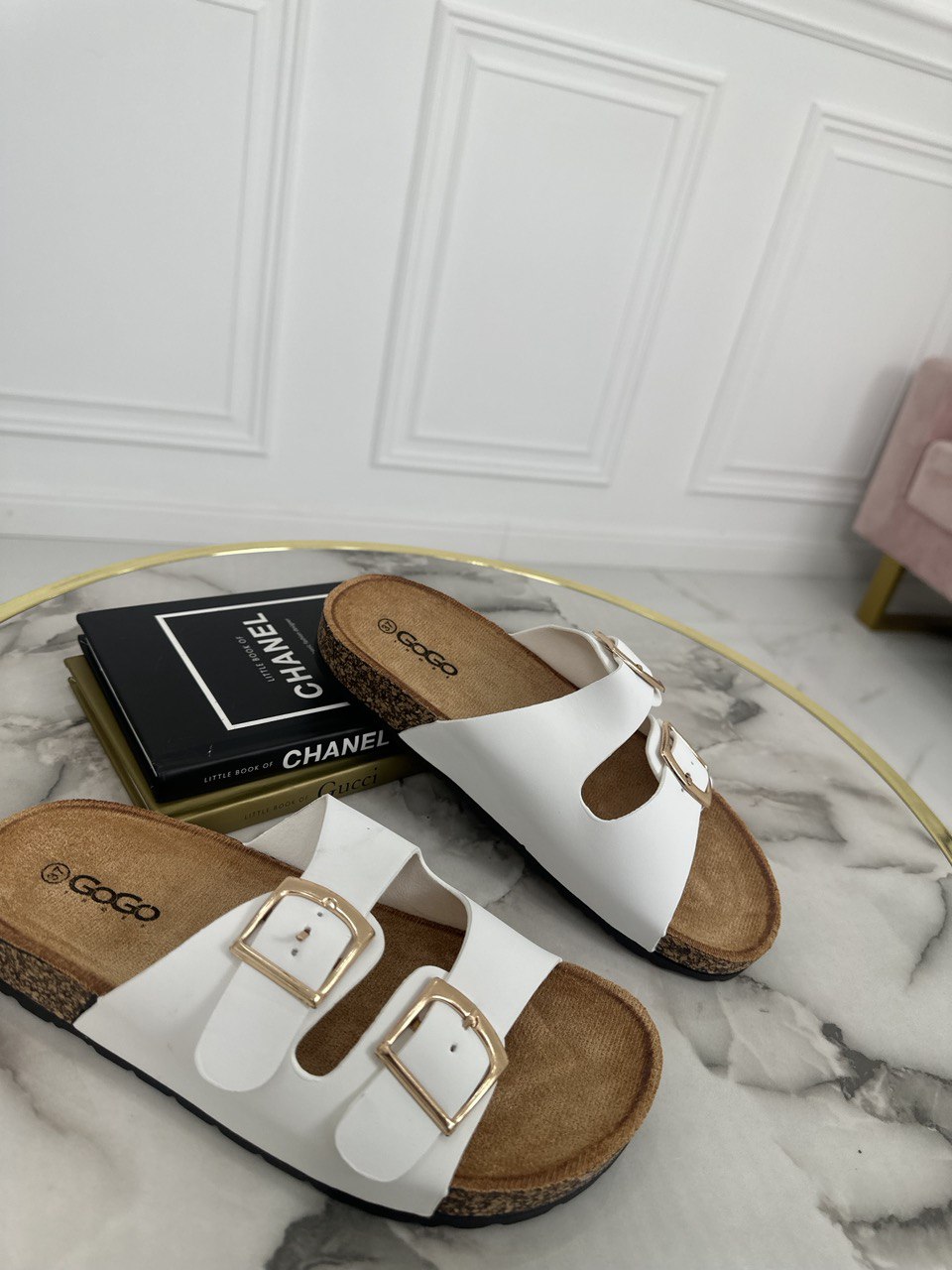 Pantofolina in ecopelle con fibbie regolabili , aperte sul retro con fondo in gomma