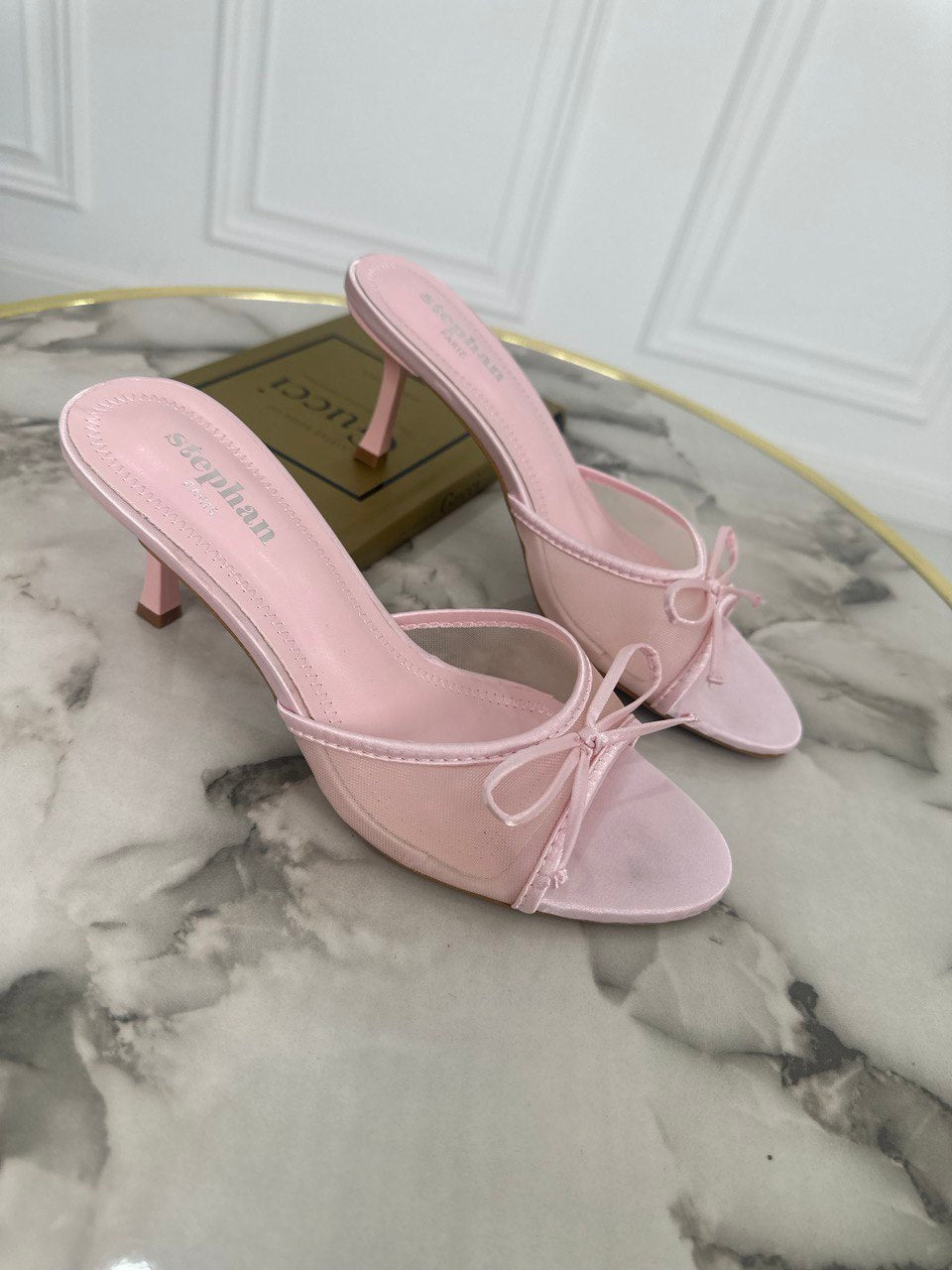 Sandali in raso con fascia larga decorata con fiocco , aperti sul retro con tacco di 7 cm