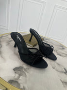 Sandali in raso con fascia larga decorata con fiocco , aperti sul retro con tacco di 7 cm