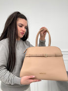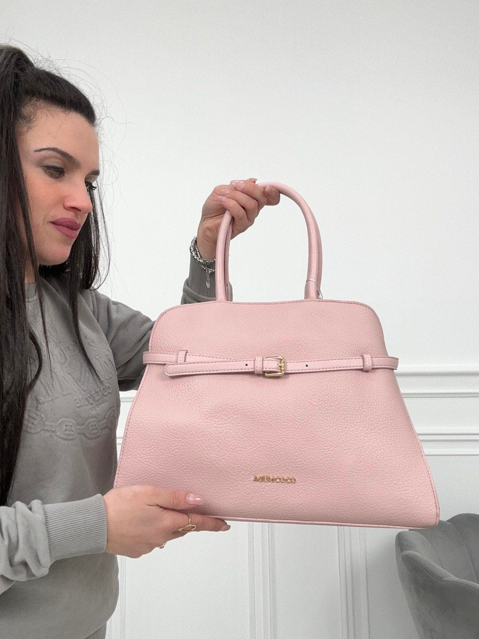 Borsa in ecopelle , con cinturino sul davanti , chiusura con cerniera , manico da braccio e tracolla da spalla removibile.