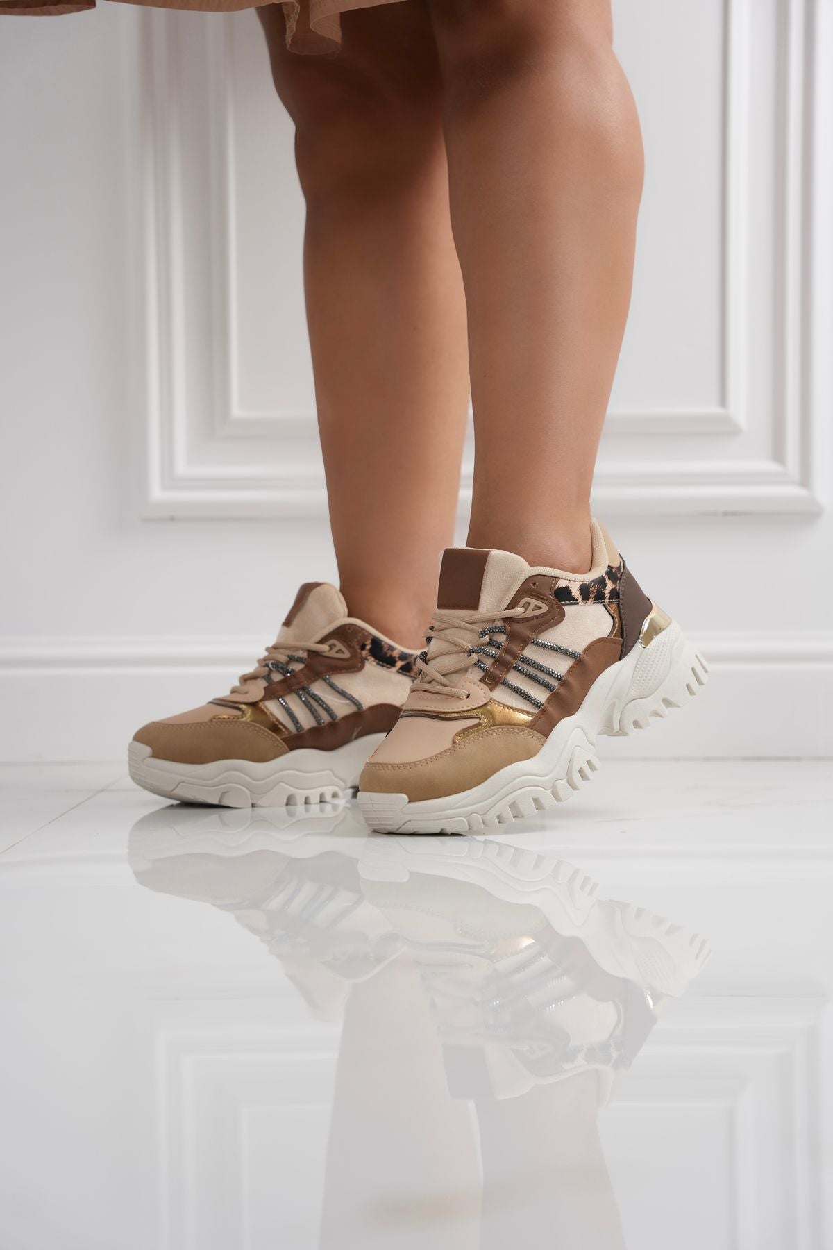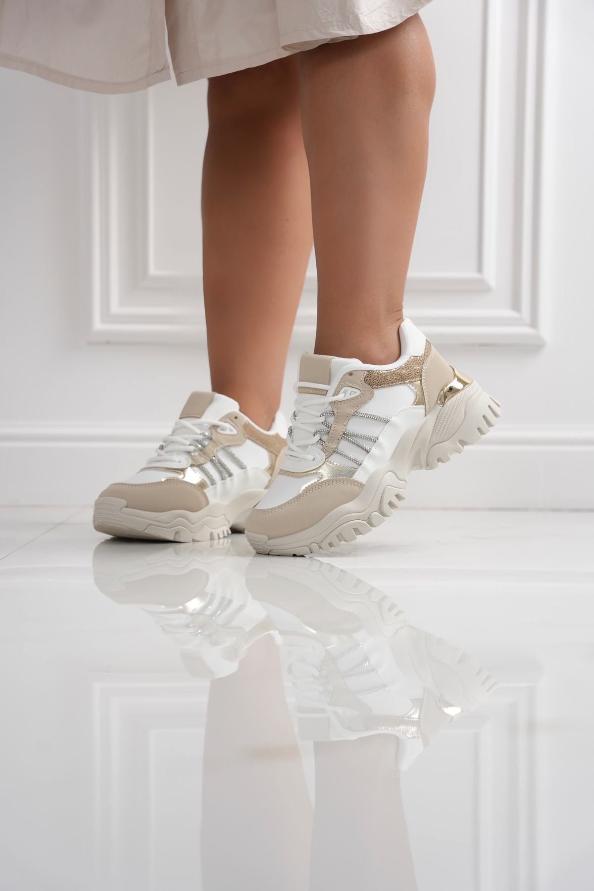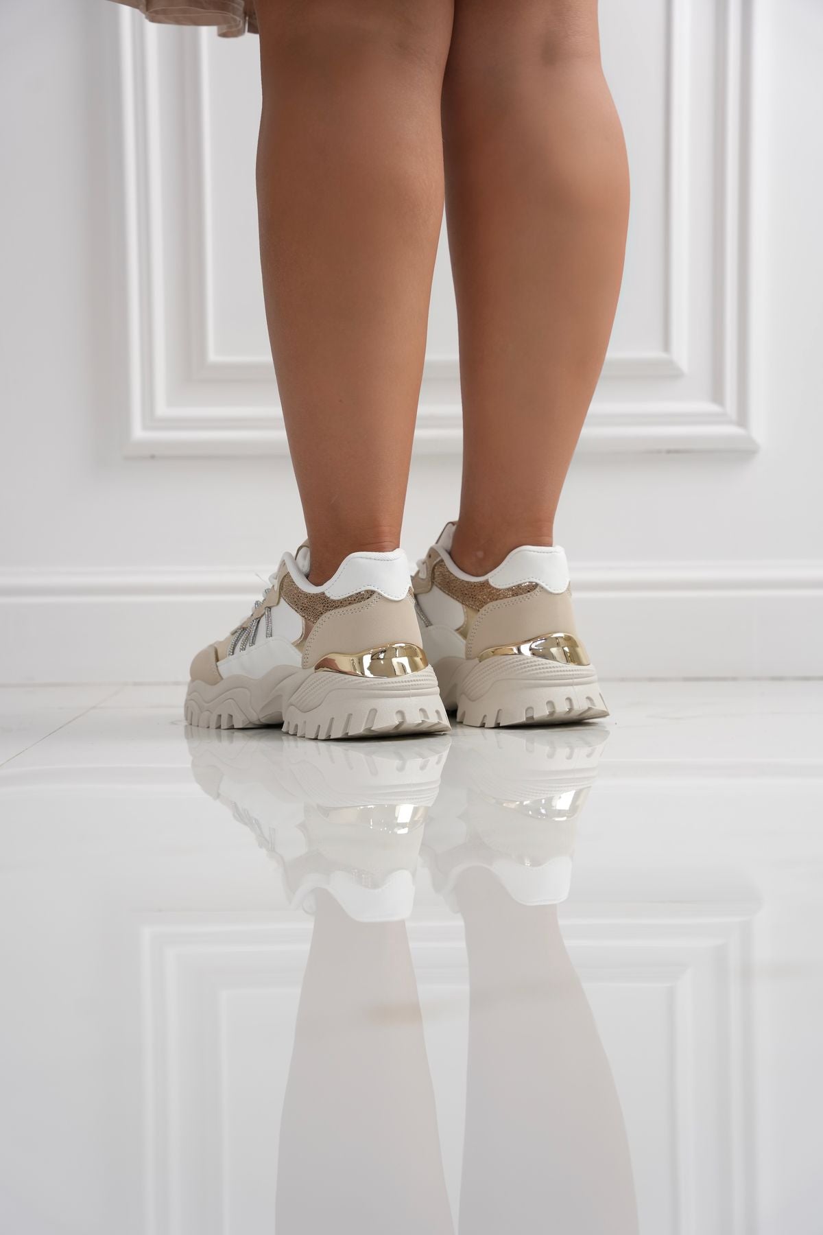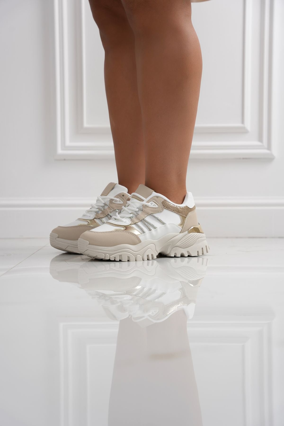 Scarpetta con tomaia in ecopelle , decorate con fasce in strass laterali , chiusura con lacci e fondo in gomma di 4 cm
