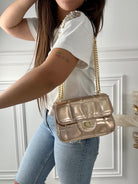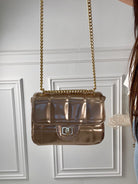 Borsetta in ecopelle lucida , chiusura con bottone e cerniera e tracolla da spalla in catena.