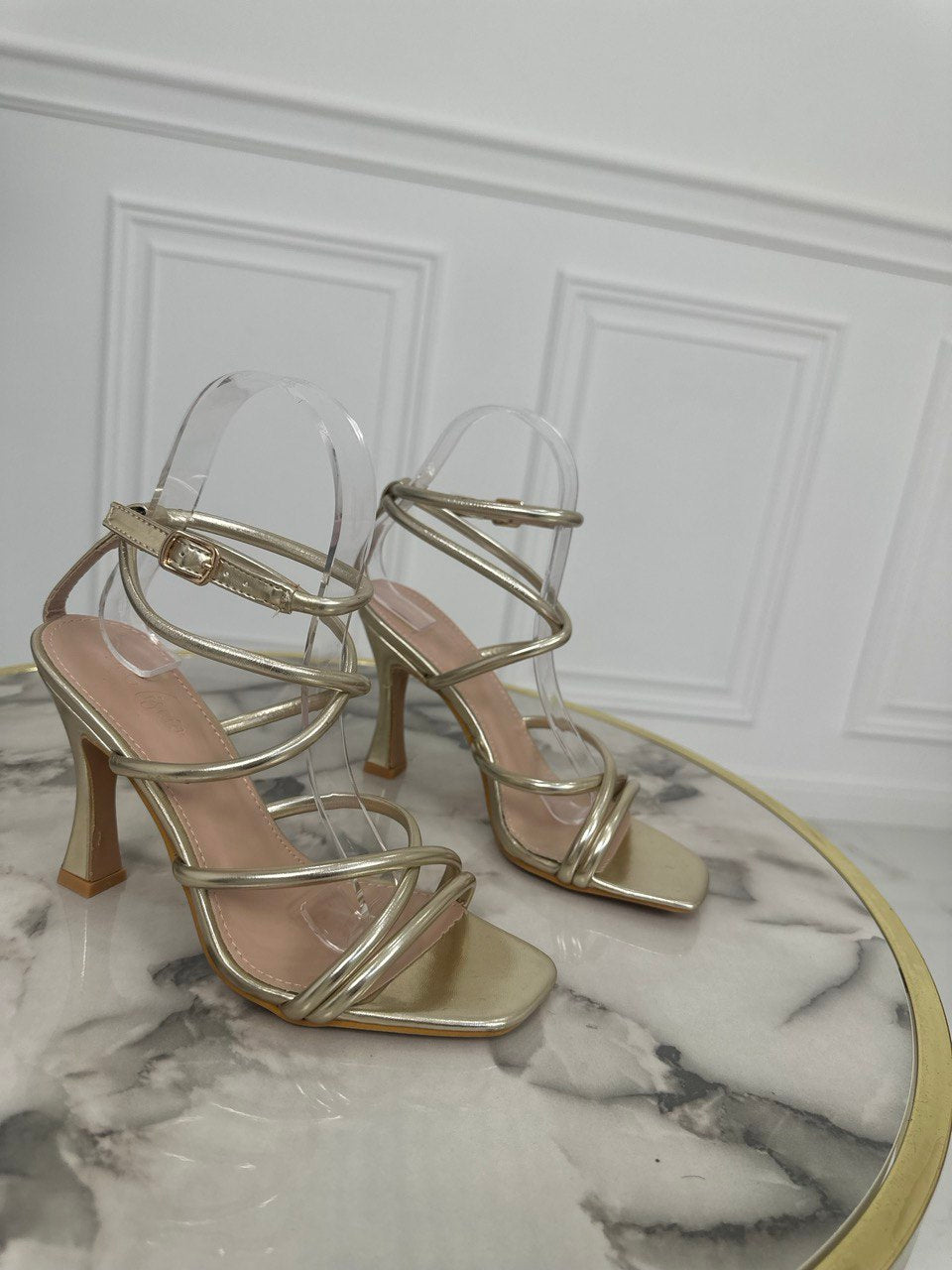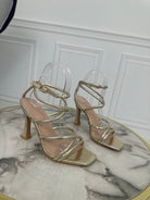Sandali in ecopelle con fasce sottili ad incrocio , chiusura con cinturino e tacco di 10 cm