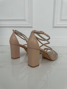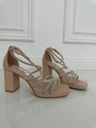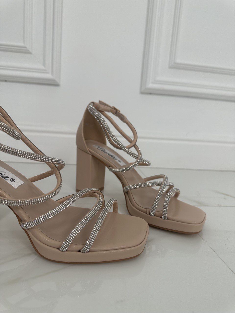 Sandali in ecopelle con fasce sottili decorate con strass , chiusura con cinturino e tacco largo di 7 cm