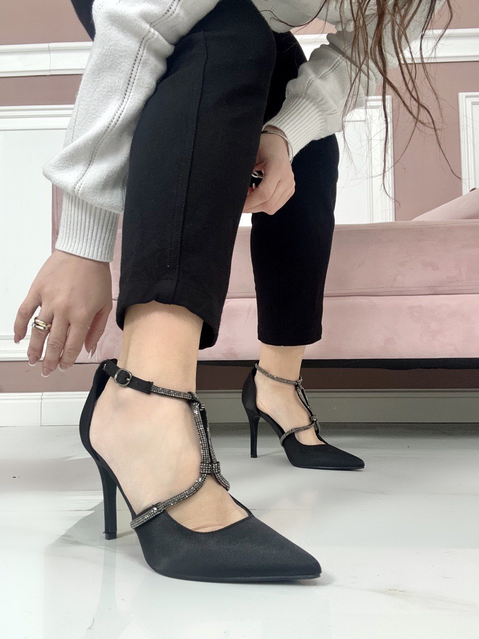 Decolletèa punta in raso , con strass sul collo piede , chiusura con cinturino e tacco a spillo di 10 cm