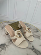 Sandali in ecopelle con fascia larga e dettaglio dorato , aperti sul retro con tacco largo di 5 cm