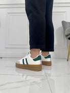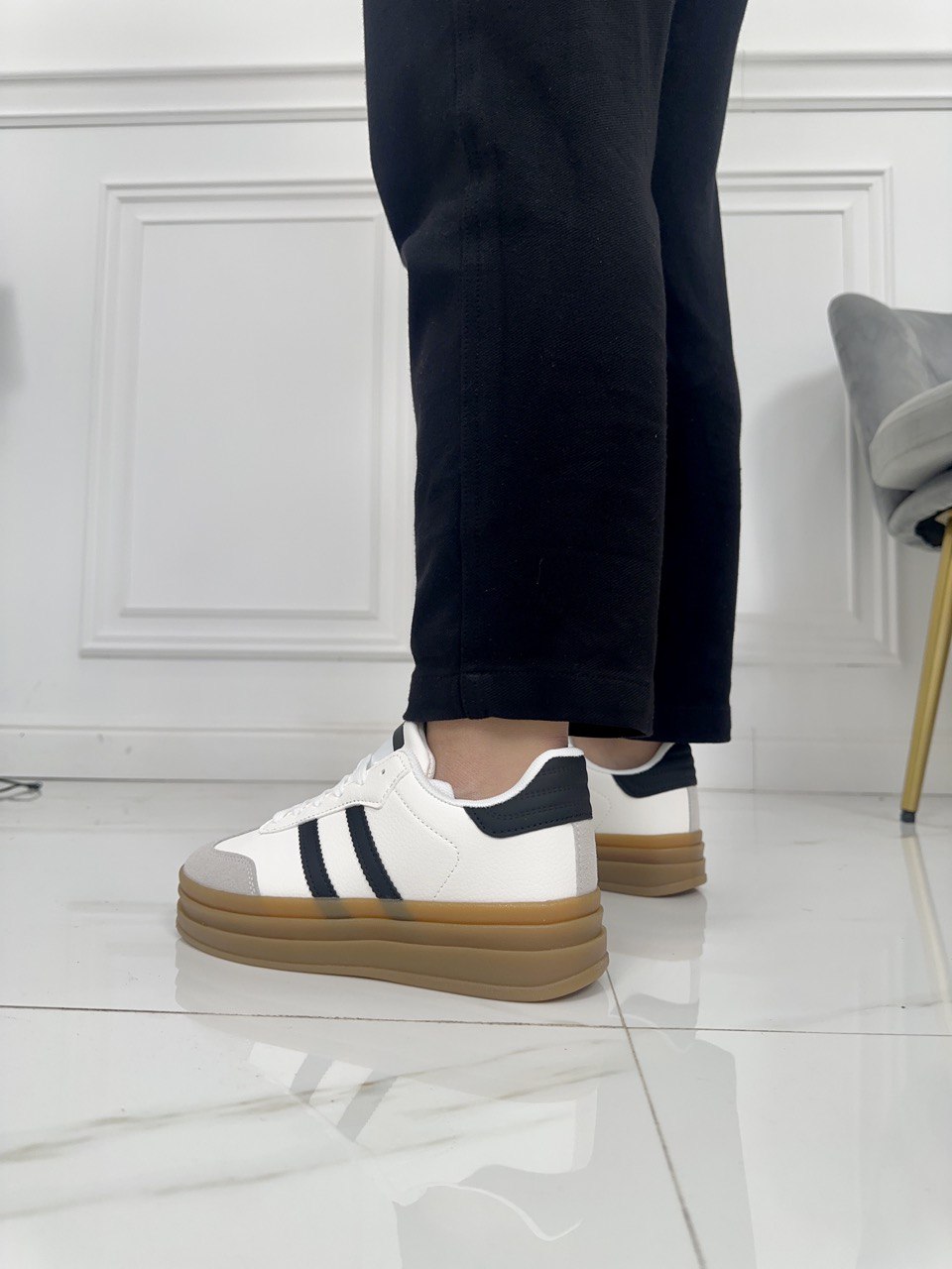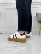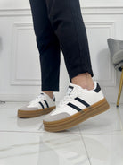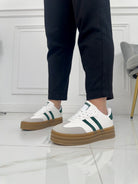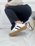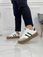 Scarpetta in ecopelle con strisce laterali , chiusura con lacci e fondo in gomma di 3 cm