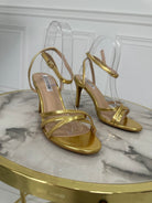 Sandali in ecopelle con fasce sottili ad incrocio chiusura con cinturino e tacco di 8 cm