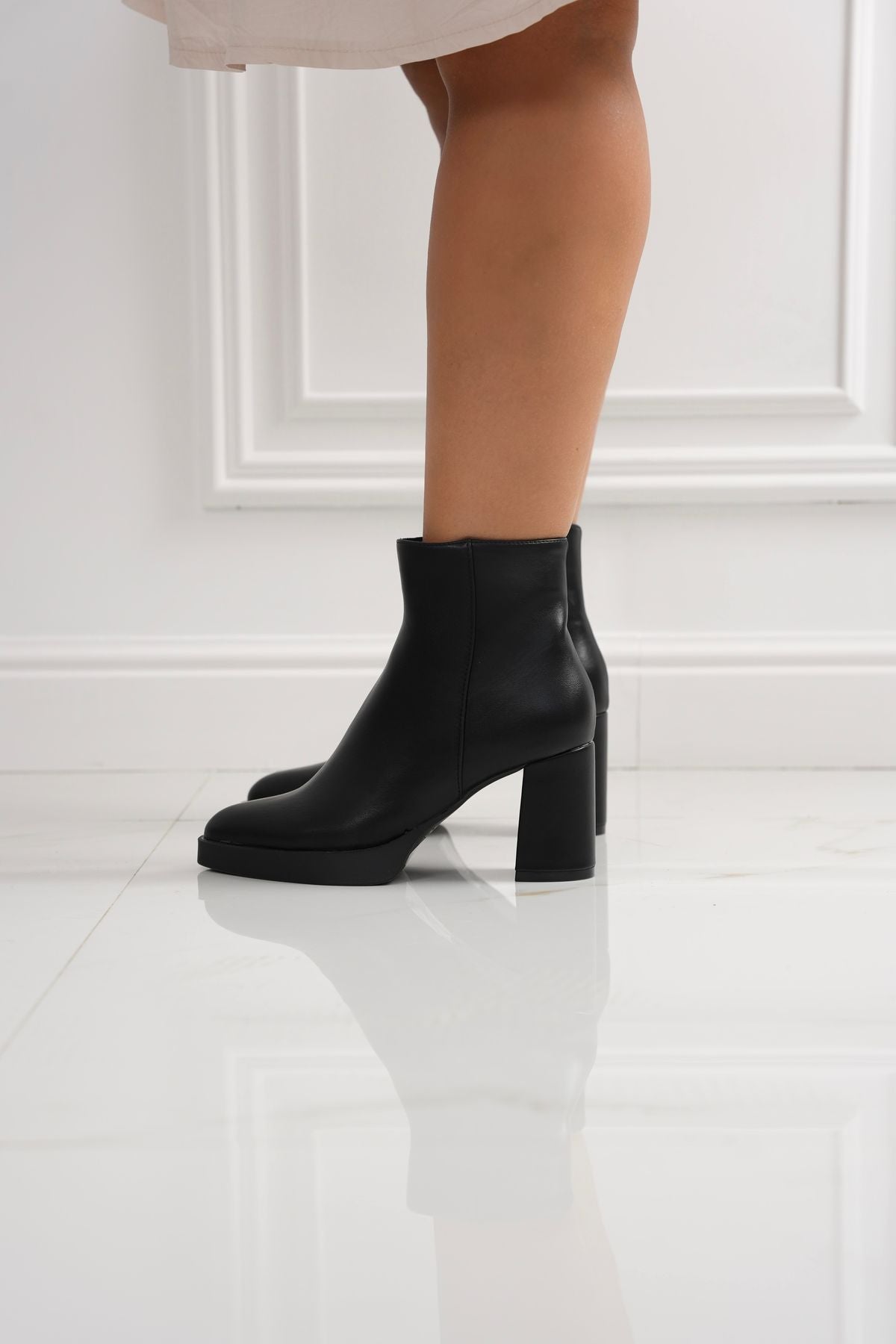 Stivaletti a punta in ecopelle , chiusura con cerniera laterale , plateau di 2 cm e tacco largo di 7 cm